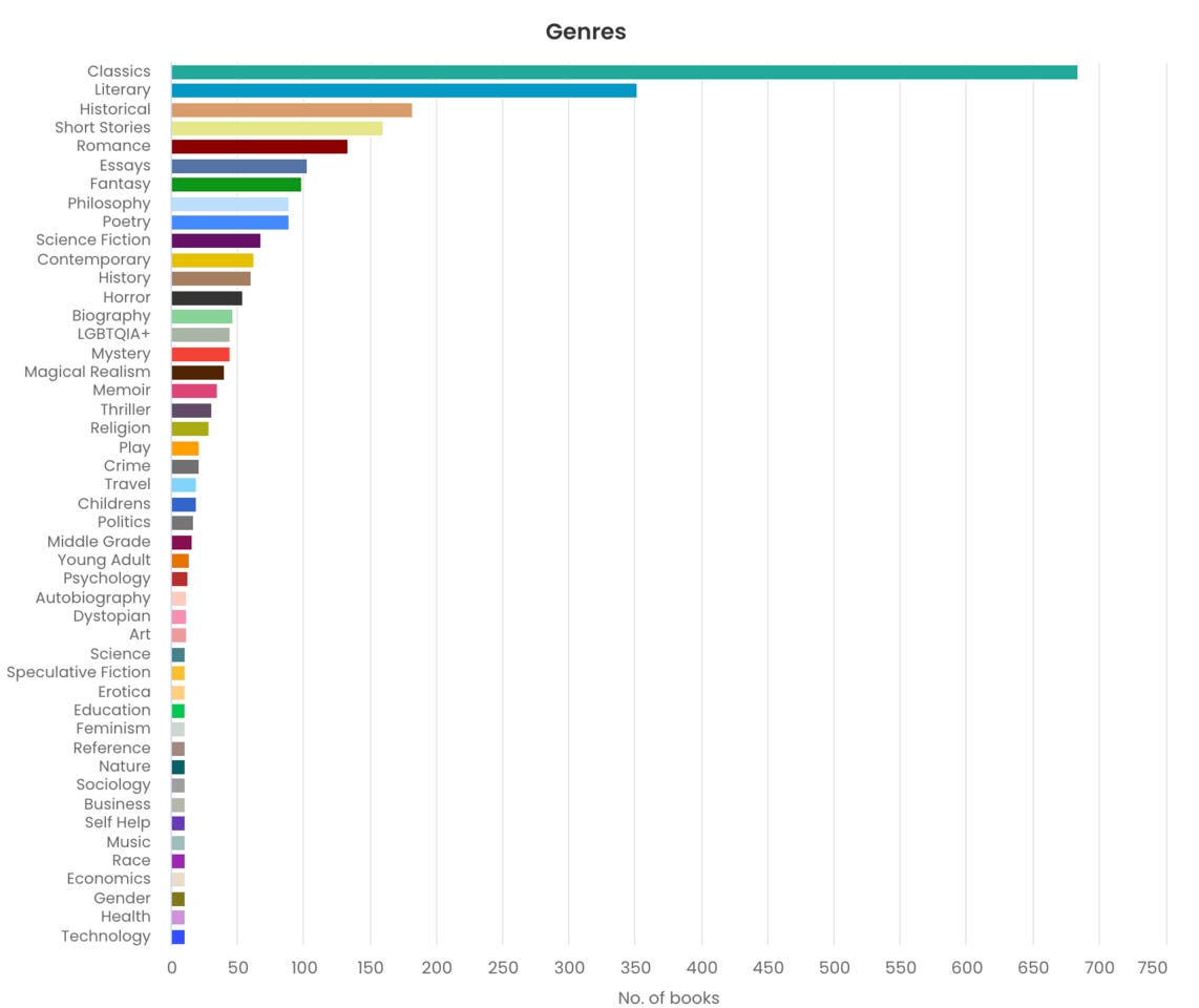 Relativamente aos géneros talvez seja onde coloco mais dúvidas na devida identificação, onde possa ir ocorrendo maior número de mudanças consoante cada livro for devidamente ajustado na sua catalogação. Mesmo assim não me espanta um primeiro lugar esmagador para os clássicos (684), e logo de seguida livros de teor mais literário, não contava com históricos e contos terem uma expressão tão elevada (160 livros), fiquei contente, principalmente pelos contos. Achava termos bem mais ficção científica (68 livros), algo onde se pode investir ainda à vontade. A poesia parece-me muito bem representada, um nono lugar correspondente a 89 livros.