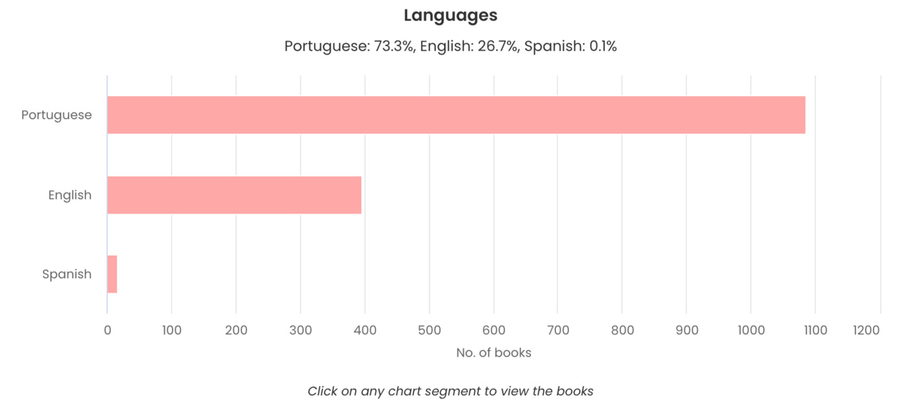 Nas línguas parece-me existir uma distribuição equilibrada, ganha claro o português com 73,3% e logo de seguida o inglês a ocupar mais de 25%, com 395 livros. Por fim um único livro em espanhol, Javier Marias com o seu ” Corazon Tan Blanco”. Provavelmente outros em espanhol chegarão. Achamos uma tradução horrível da Alfaguara para este escritor, decidimos então pela provável leitura da obra no original.