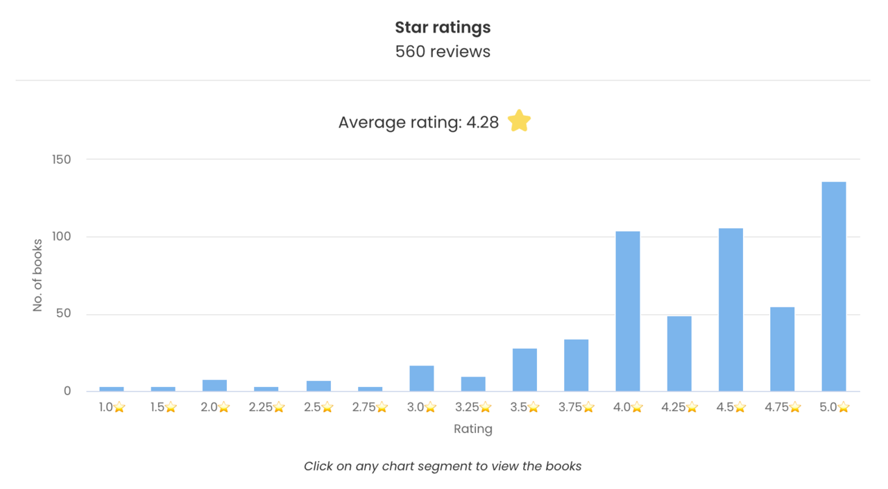 Para terminar este primeiro post sobre a biblioteca cá de casa, dizer que o meu average rating é de 4,28 estrelinhas. Tenho ali bastantes leituras com 5 estrelas (136 livros). Para futuro, mesmo nas releituras, tentar perspectivar a minha relação com todos estes livros. Acho difícil entendê-los todos em mim como perfeitos ou insuperáveis, portanto alguns poderão descer ligeiramente para uma melhor percepção do que tenho por favoritos dos favoritos, vou colocar a questão nestes termos. Tirando este detalhe, a distribuição revela no geral os nossos livros não me desagradarem, cá em casa parece escolher-se bem o que se quer ter para ler. Os livros com avaliação inferior a 3 estrelas são cerca de 20 e para alguns destes talvez ainda me tenha de redimir, a título de exemplo “Um Quarto Com Vista” do E. M. Forster. Disto falarei num outro post sobre as minhas leituras e a biblioteca cá de casa.