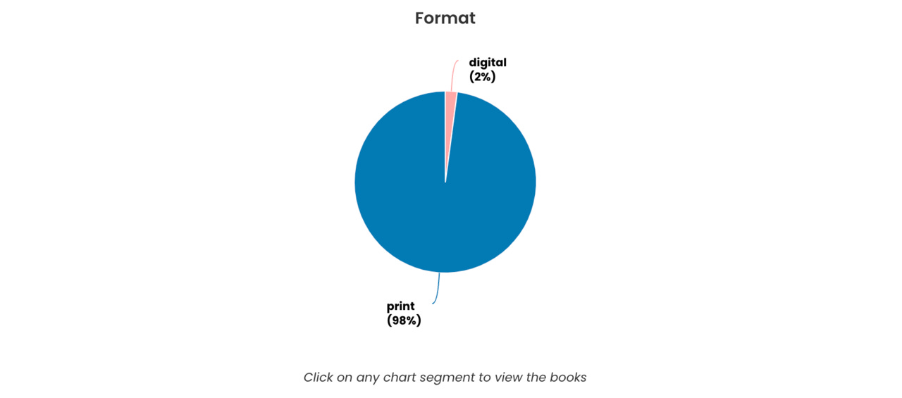 Do já dito era fácil prever o tipo de formato principal da biblioteca ser o livro físico. Pouco podem os 2% de livros electrónicos fazer em relação a isto. Cá em casa penso ser eu o que ainda vai espreitando mais o Kindle, no geral preferimos ambos os livros físicos. Acho que não posso escrutinar qual a quantidade de capas duras e moles, mas adivinho que apesar de os paperbacks existirem em maioria, não seria uma diferença tão discrepante assim. Há muitas capas duras cá por casa.