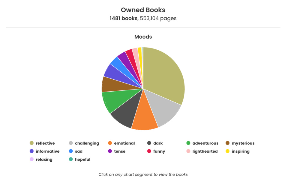 Desde que decidimos viver juntos a nossa colecção de livros naturalmente cresceu. Logo aquando a junção das estantes tornou-se-me cada vez mais difícil ter uma ideia clara de todos os livros que temos. Foi então no início de Setembro que pensei utilizar a recente conta no The StoryGraph (uma óptima alternativa ao Goodreads) e durante praticamente um mês a nossa lista de livros foi-se concretizando. Alguns dias listava apenas só um cubo em outros nenhum e no último dia uma pequena maratona hercúlea, a última estante de uma única empreitada. Grande parte dos livros não existiam ainda na base de dados, pelo menos com as nossas edições, foi custoso ter de acrescentar mais de um milhar de livros, capas, número de páginas, sinopses… um filme. Neste post quero registar a experiência de ver pela primeira vez todos os livros de casa listados e como o The StoryGraph pode ou não surpreender com a análise estatística dos dados da nossa biblioteca. Conto que seja o primeiro de vários posts a devanear sobre os meus dados de leitura.