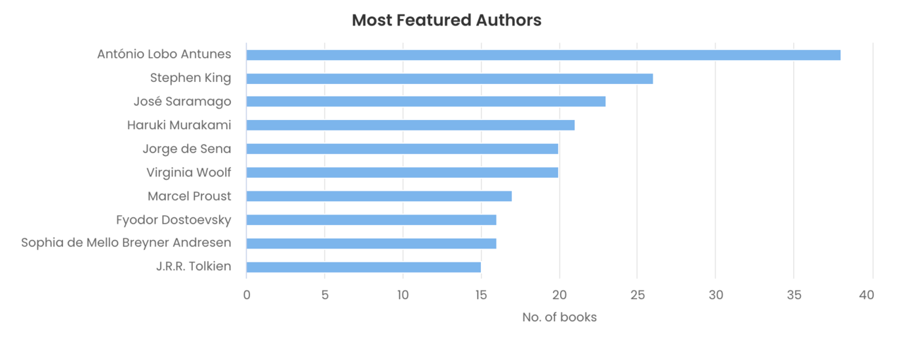 Em relação a autores, algumas coisas surpreenderam-me, mas começo pelo óbvio. O escritor com maior número de livros cá em casa é o António Lobo Antunes (38 livros), o segundo lugar foi uma surpresa tendo em conta até à data só eu o ler, Stephen King com uns jeitosos 26 livros. O bronze vai para José Saramago (26) e na corrida chega logo atrás o Murakami (21). Virginia Woolf surge-nos em quinto num empate com Jorge de Sena (20) e Proust apresenta-se em sexto com 17 livros, impressionante se pensarmos que a sua obra facilmente se resume no geral a um livro de 7 volumes, mas temos eventualmente algum ensaio, os contos e lá ocupa uma posição inesperada. A lista termina com Dostoevsky e Sophia de Mello Breyner Andrensen empatados (16) e Tolkien (15). Dizer escandaloso não ter mais Fiodór e isso ter de ser alterado.