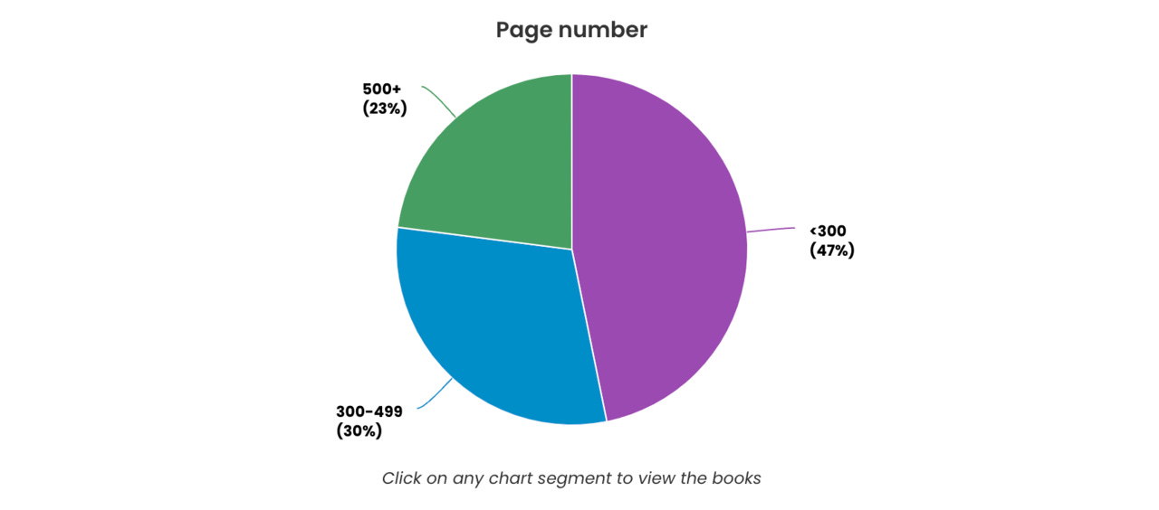Já o número de páginas encontra-se mais distribuído. Na maioria os livros têm menos de 300 páginas (47%), 693 livros na verdade, logo seguidos por livros de 300-499 páginas (30% – 447 livros) e por fim 23% dos 340 calhamaços com mais de 500 páginas. Pode-se assim constatar que a razão entre o número de livros comprados e as páginas que possuem é inversamente proporcional.