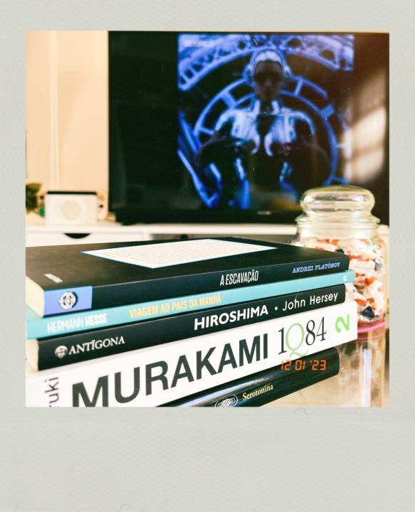 Para dezembro continuo a ler o “Confissões” de Santo Agostinho e “Stories of Books and Libraries” da Everyman. “Serotonina” foi o meu segundo Houellebecq e para já prefiro o “Partículas Elementares”, talvez pelo vinculo estabelecido com “Admirável Mundo Novo” do Aldous Huxley. Ainda mantenho a ideia deste escritor dificilmente ser capaz de me surpreender com um mau livro ou menos literário. Este em particular não acho inesquecível, relevante por um retrato das nuances da sociedade actual e isto já é fazer muito. A problemática da exploração e sofrimento animal, da insuficiente produção alimentar, a internet. A promessa química de uma forma de sofrimento menos emocional, a entrega da libido como forma de pagamento a uma outra lucidez não necessariamente para agir de forma a um fim diferente. Li o segundo volume de “1Q84”, estou a gostar bastante do livro e já iniciei a terceira parte. Tenho uma relação diferente com este escritor, talvez estabelecida nos mesmos parâmetros dos seus livros, com emoções diferentes, de natureza mais inexplicável e contemplativa. Até ver pode este ser o meu livro favorito do Murakami. “Hiroshima” de John Hersey é um livro breve e no qual me demorei. São facultados ao leitor seis testemunhos de sobreviventes ao ataque americano a “Hiroshima”. As várias descrições foram complicadas de assimilar e preferia então parar a leitura de forma recorrente. Achei uma leitura muito boa por acrescentar e, ao contrário do belo “Oppenheimer”, necessária.