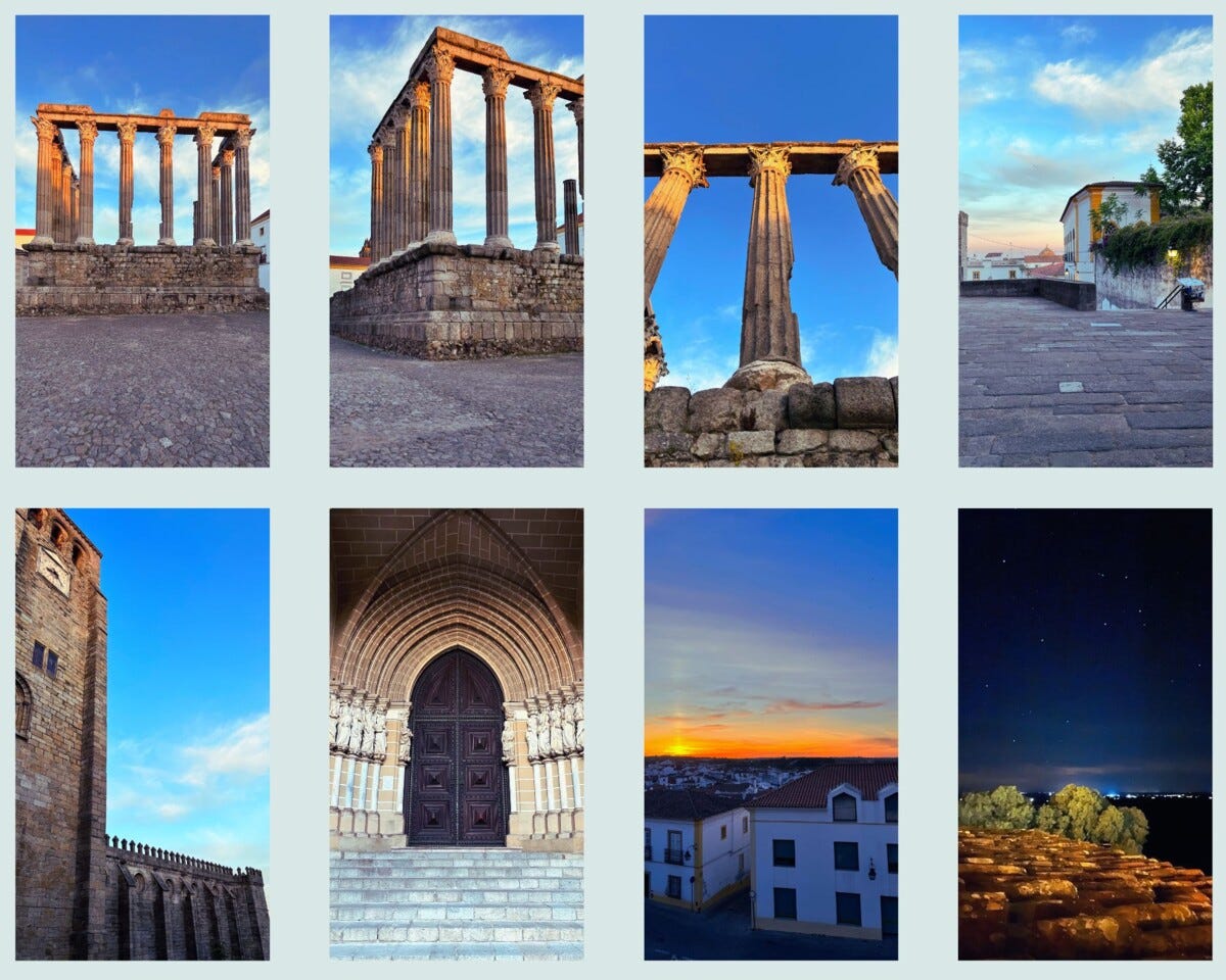 Para jantar fomos a Évora, onde de relance vimos a cidade o templo o fim do dia. Perto do templo romano é difícil não nos impressionarmos com a sua presença, as suas colunas coríntias altas graciosas a erguerem-se ao céu. O sol lançava os raios dourados sobre as antigas pedras onde ancestrais grandiosidades desse império presente passado são ainda emanadas. Belo pôr do sol o de Évora. Voltámos pela nacional numa exterior escuridão, rara de se conhecer. Éramos sozinhos fechados, nós e as nossas vozes numa caixa musical, numa estrada estreita no espaço imenso sem acontecimento. Um receio meu na felicidade, um receio lembrou-me “Animais Nocturnos”, filme de Tom Ford tão mais artístico ao livro “Tony and Susan” de Austin Wright. Não existiam animais. Chegados, a terminar o primeiro dia, explorámos ainda o convento pela noite. Quanto tempo tem um dia?