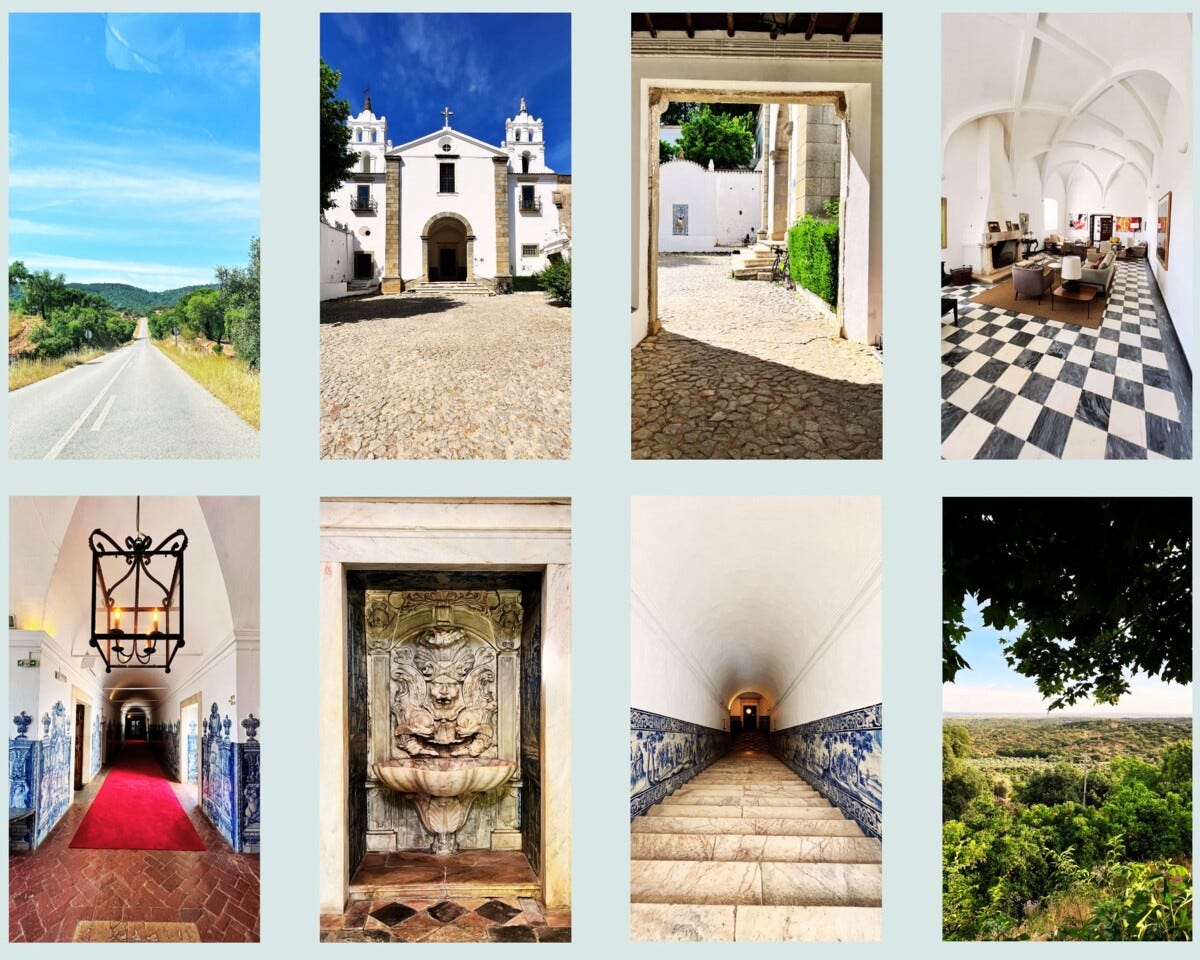 A cadeia montanhosa com 653 metros de altura fica entre Estremoz e Redondo, e situado na Aldeia da Serra fica o Convento de São Paulo, hotel rural onde ficámos hospedados. Chegados e recebidos com simpatia, instalámo-nos. O calor era tanto que enquanto explorávamos alguns interiores do convento logo fomos experimentar a piscina. Refrescados, decidimos o resto da tarde para descansar.