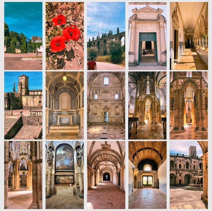 Acordámos relativamente cedo e o primeiro destino traçado era Tomar. Chegados à cidade do Convento de Cristo, visitado de seguida, fomos antes tomar um pequeno almoço banal num café igualmente comum, onde a espera foi longa e a paciência não abundava. O dia era de sol na segunda semana de Maio, tivemos sorte para a aventura, o calor para o sul ainda era suportável e não sofremos com os rigores do inverno. Despachados do pequeno almoço rumámos ao convento, um gigante à distância, desproporcional no contexto da cidade. Ao chegar lembro as papoilas na terra, do aqueduto imponente e da entrada cheia de crianças a serem crianças, fugimos do caos, subimos e entramos no Convento de Cristo.